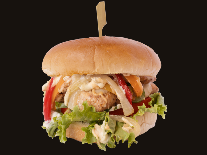 Crispy fried chicken fillet, Swiss cheese, lettuce, tomatoes, rosemary garlic aioli, and secret Alley sauce.